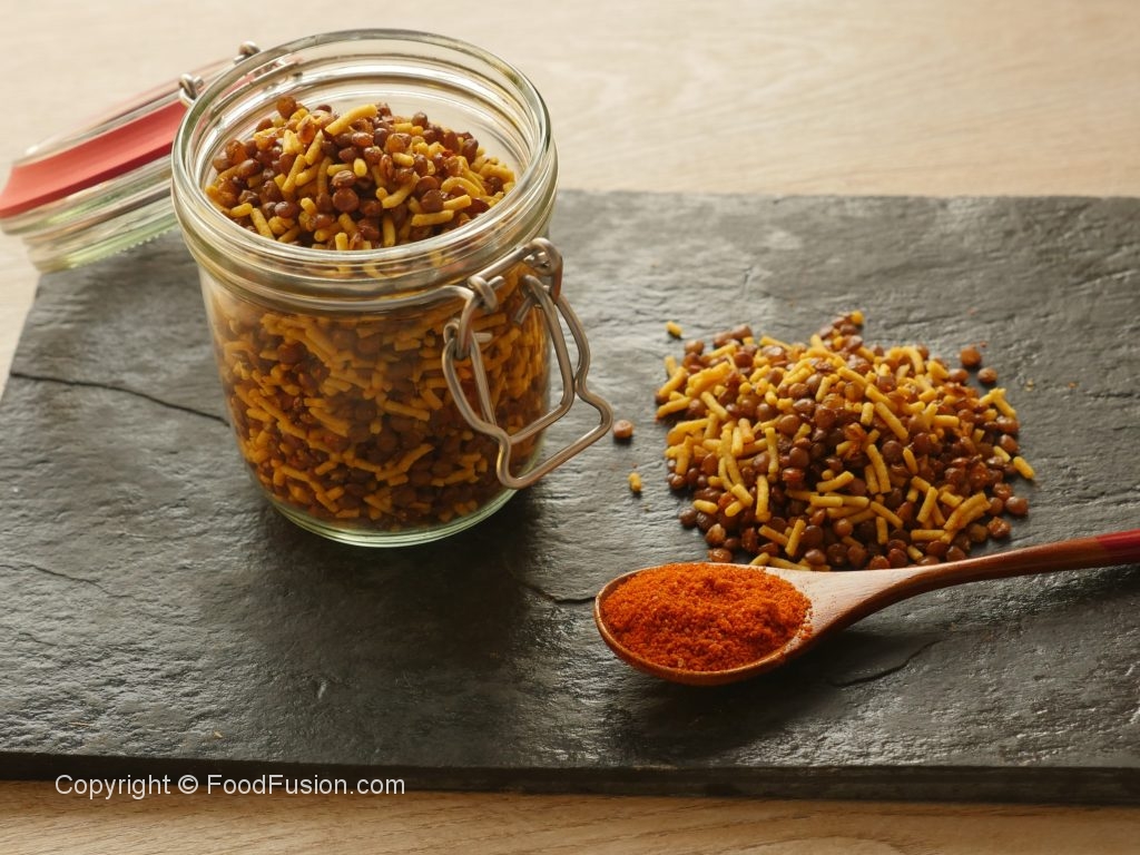 In wok,heat cooking oil and fry sev from both sides on low flame until golden & crispy then strain & let it cool completely as it cools it will become crisper then break it and crush it lightly with your hands.
