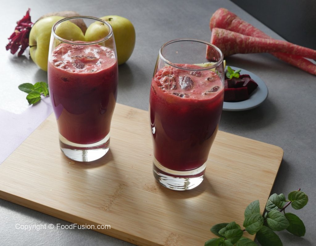 In juicer machine,add apples,beetroots,carrots,ginger and extract juice.