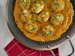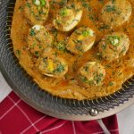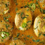 -Place halved eggs,pour gravy,sprinkle fresh coriander,green chilli,cover & cook on low flame for 1-2 minutes & serve!