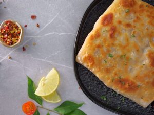 -Add 2 tbs of whisked eggs,onion,fresh coriander,green chilli,cheddar cheese slice & fold all sides of dough,apply whisked eggs & seal properly.