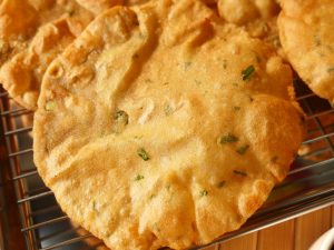 In wok,heat cooking oil and fry puri on medium low flame until golden brown.