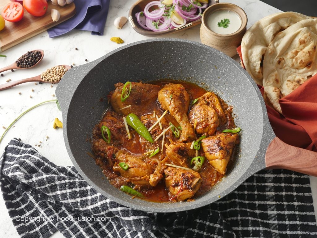 In a wok,add cooking oil,marinated chicken and cook on low flame for 12-15 minutes then cook on high flame for 2-3 minutes and turn sides in between.