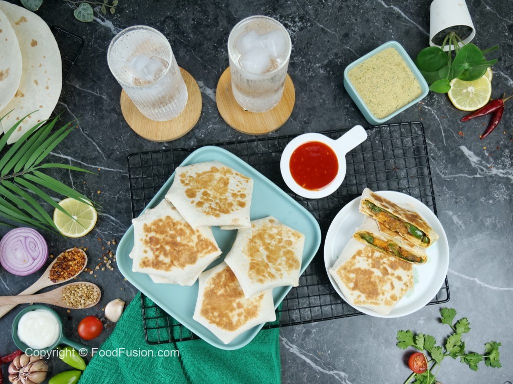 -Tortilla per salad patta,tayyar mayo & yogurt sauce,tayyar bbq chicken filling,mayo & yogurt sauce & cheese slice dal ker edges ko fold ker ka center ko cover ker lein.