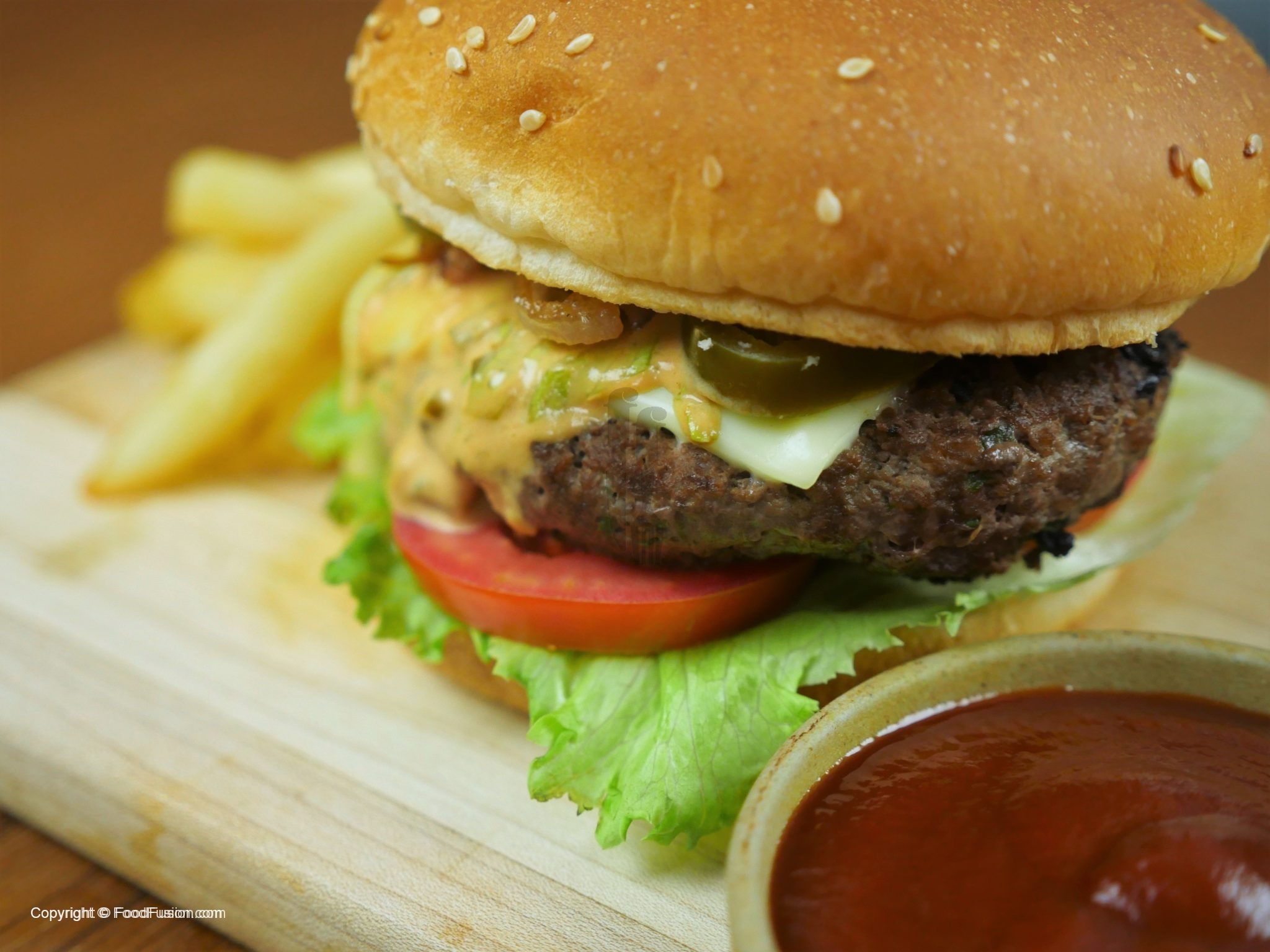 In assembling you can add any vegetable of your choice and assemble burger any ways you like. How we did is: On bun spread mayonnaise, ice burg lettuce leaf, tomato slices, beef patty with cheese, fusion sauce, caramelized onion or raw onion slices, jalapenos slices and top bun.