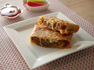 Place beef patty and fold all edges of flat bread (roti) and apply egg white to seal the edges.