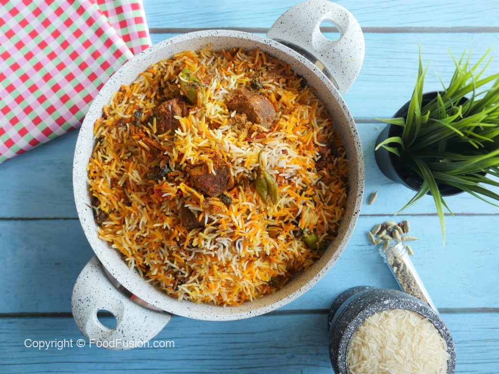 Add & spread half quantity of boiled rice,reserved gravy,steam cooked beef pieces,fresh coriander, mint leaves,fried onion and remaining quantity of boiled rice.