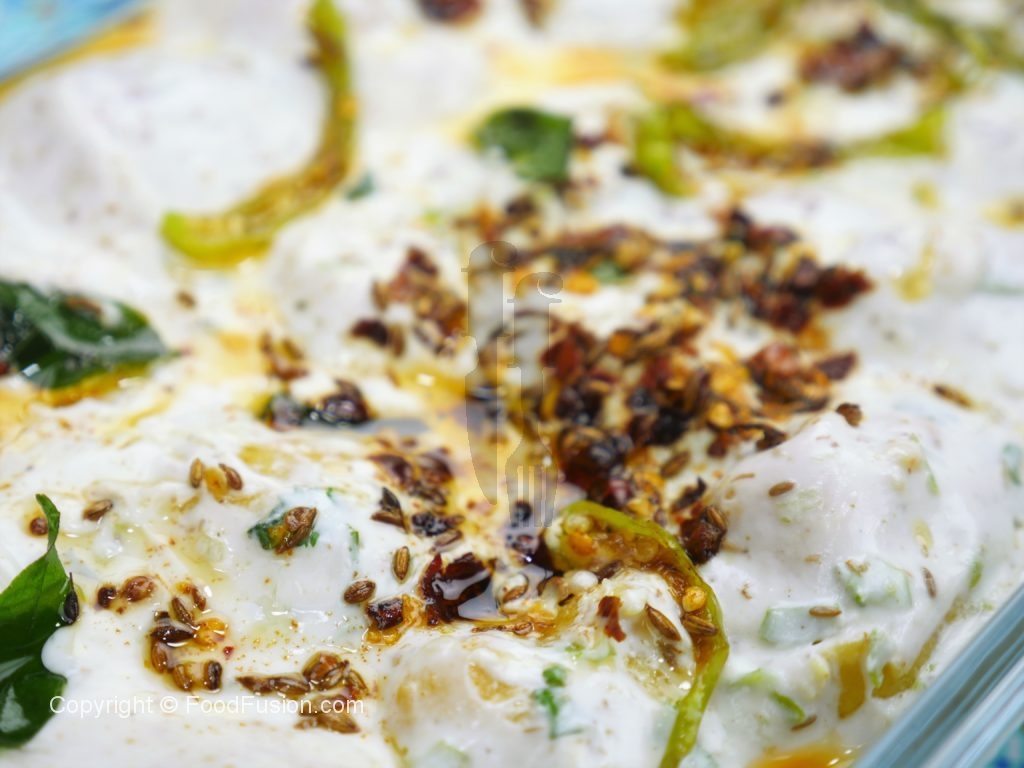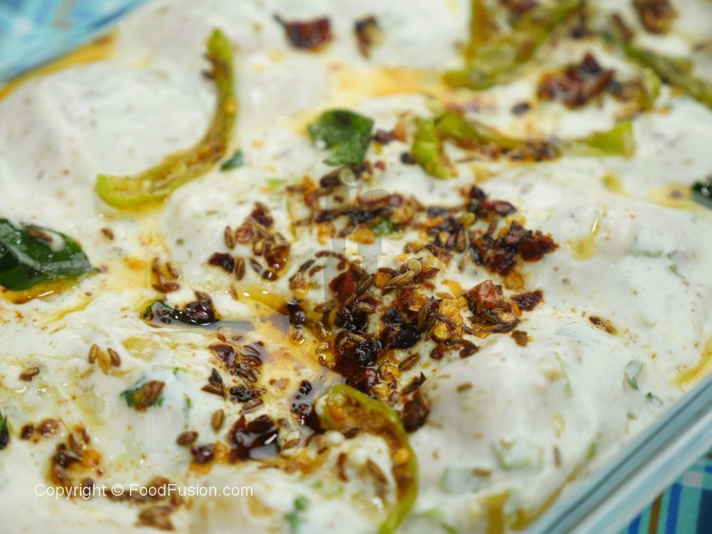 In serving dish,add fried baray (dumplings) and spiced yogurt.