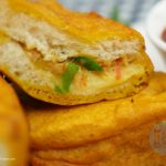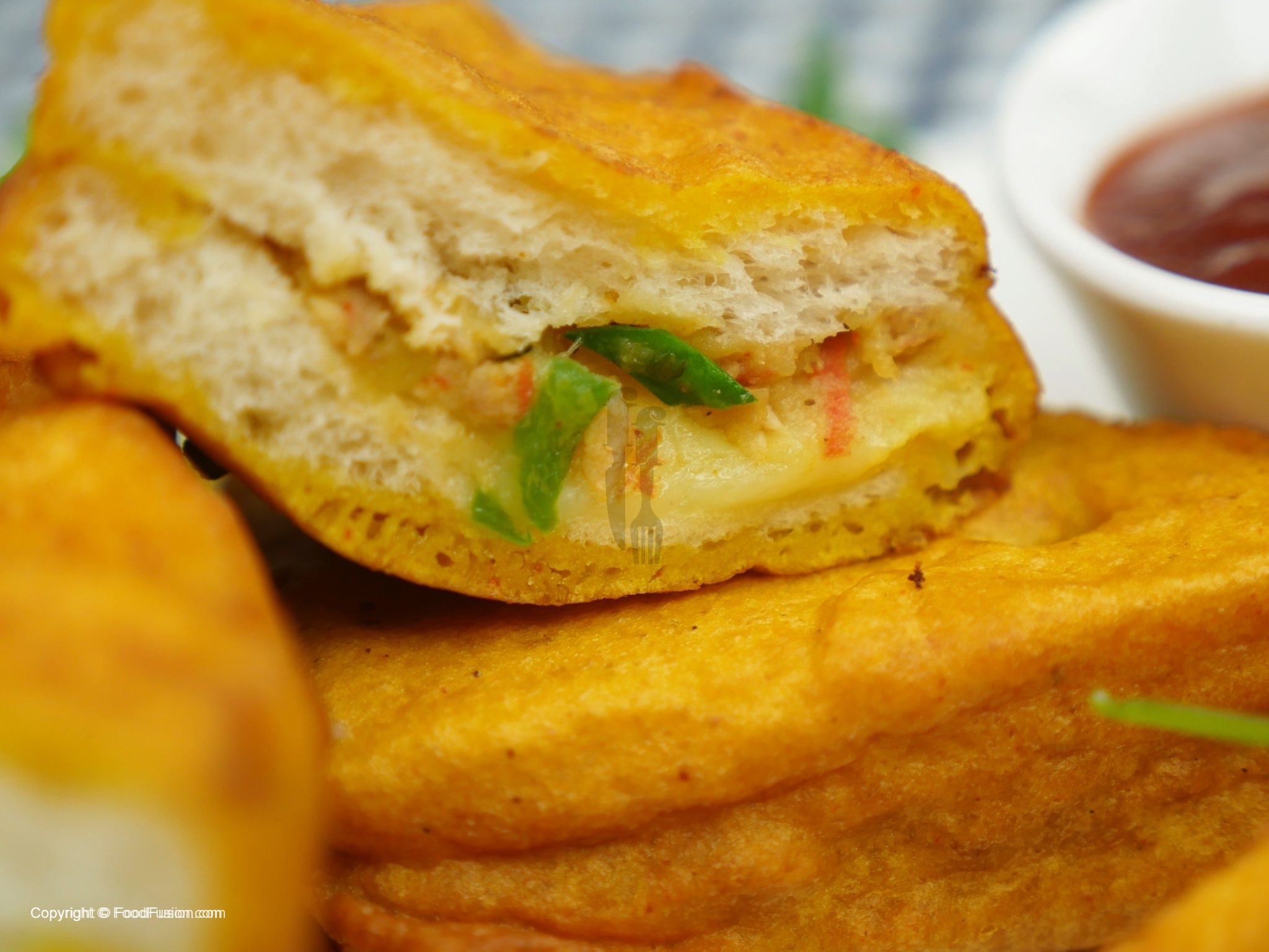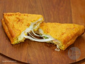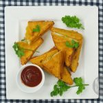 Stuffed bread slices ko triangular shape mein cut ker lein.