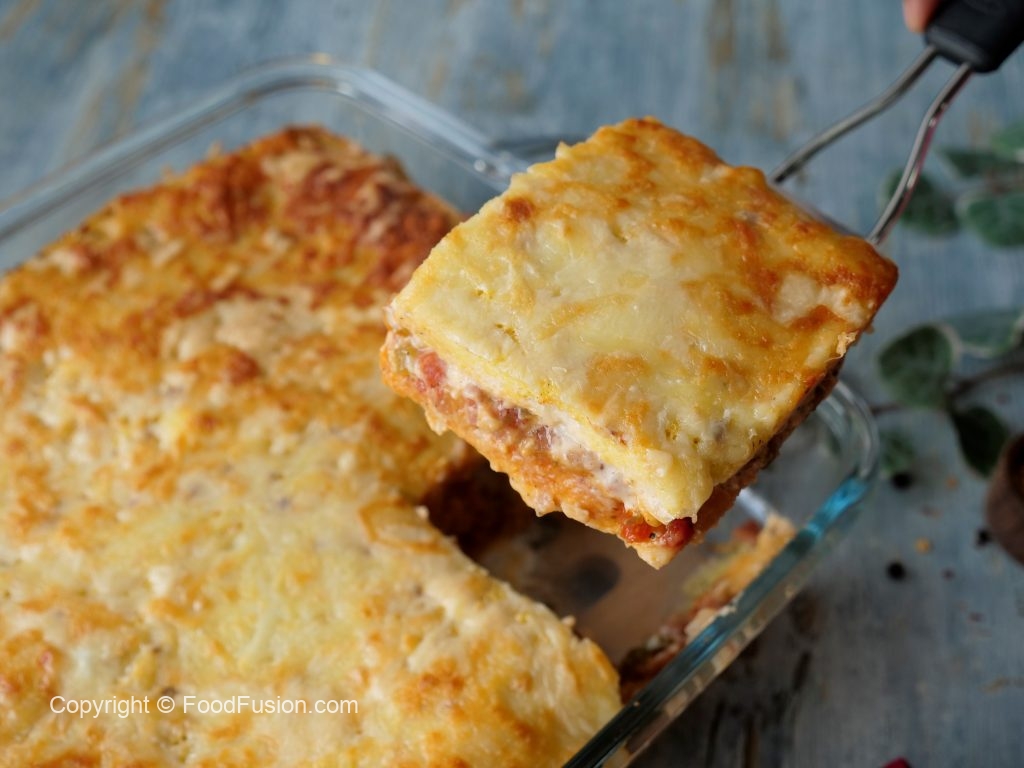 In a baking dish,add & spread prepared white sauce,bread slices,prepared vegetable sauce,white sauce, cheddar cheese,mozzarella cheese,bread slices,red sauce,white sauce,cheddar cheese,mozzarella cheese,bread slices,pour prepared egg mixture,cheddar cheese & mozzarella cheese.
