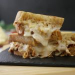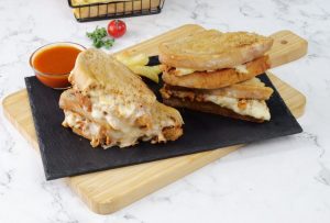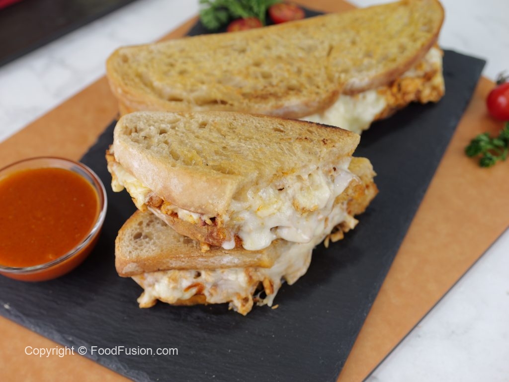 -On toasted sour bread slice,add melted chicken & cheese & top with another bread slice to make a sandwich (makes 4-5 sandwiches).