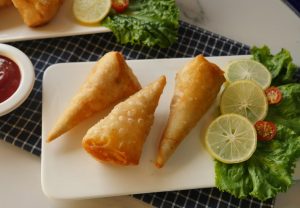Take samosa wraps,apply flour paste and make pocket,add chicken filling in the center and fold into the shape of cone and apply flour mixture on the edges and bring the edges together and seal the edges properly (makes 14-15).