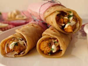 Paratha per butter chicken,pyaz,hara dhania aur cream dal dein,roll ker ka butter paper mein wrap ker lein aur chutney ka saath serve karein (makes 6).