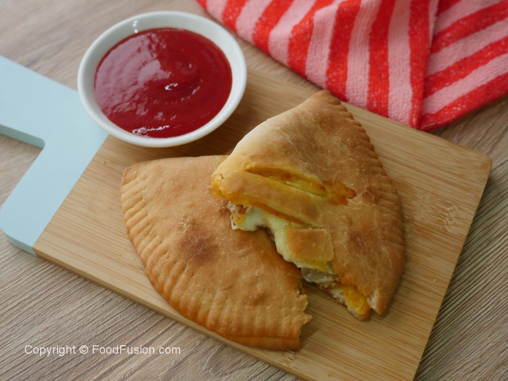 Baking dish per tayyar calzone rakh ker oil sa grease ker lein aur knife ki madad sa surface per marks laga lein (makes 4).