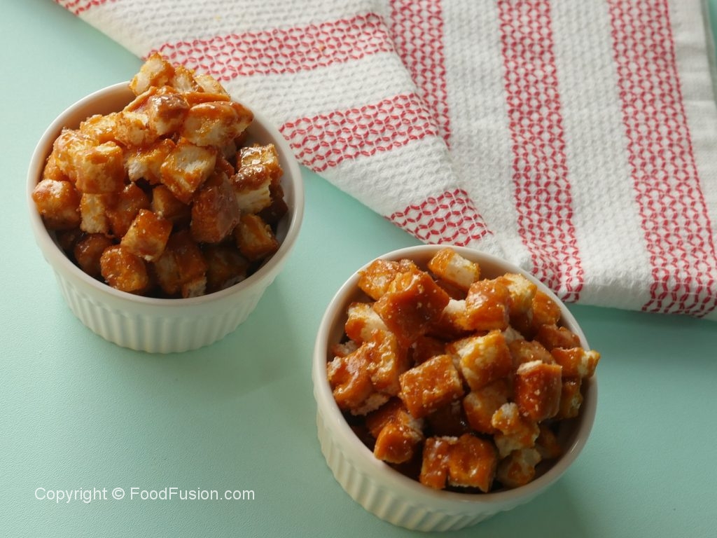 In wok,add bread cubes and toast on low flame until crispy & set aside.