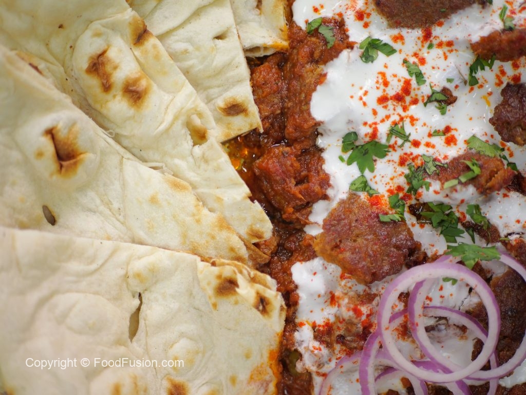 -Serving platter mein Chapta Cut Kabab Masala dalein, upar se whisked yogurt dalen, garnish karein kashmiri red chilli powder, onion rings, reserved kabab pieces, lemon slices aur fresh coriander ke saath, aur naan ke saath serve karein!