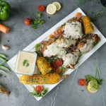 -On a serving platter,add grilled vegetables,chicken tikka pieces & grilled corns.