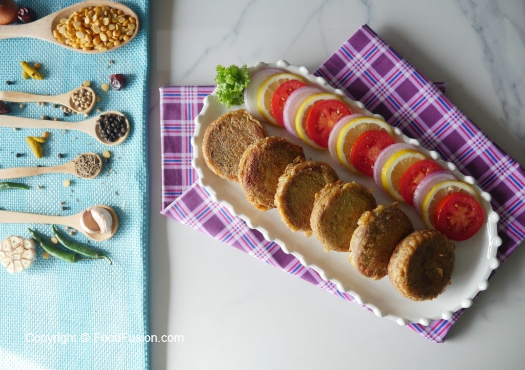 Grease hands with oil,take a mixture (65g) and flatten on your palm,add cheese filling and make kabab of equal sizes (makes 34-35).