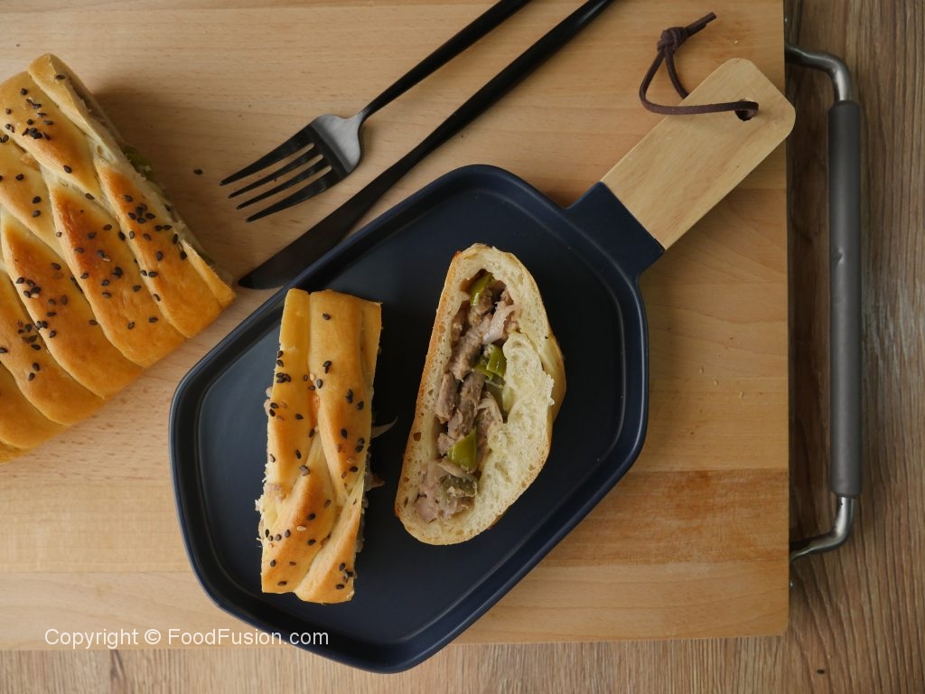 Braid ki tarhan overlap kertay hoye bread ka cuts ko alternately bundd kertay jayein (makes 2).