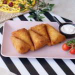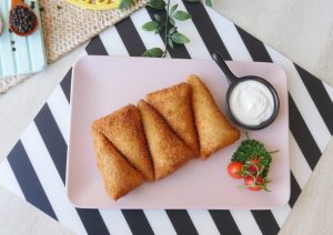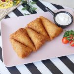 Brush flour slurry on one side of bread and fold bread slice to make a cone,add chicken filling (1 & ½ tbs),mozzarella cheese (1tbs),apply flour slurry on the edges and bring the edges together and seal the edges properly.