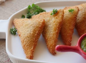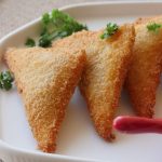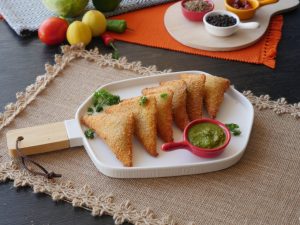 Pani laga lein,cheese slice aur tayyar chicken filling (1 tbs) rakh dein aur fold ker ka triangle shape bana lein aur edges ko press ker ka properly seal ker lein (makes 20-22).