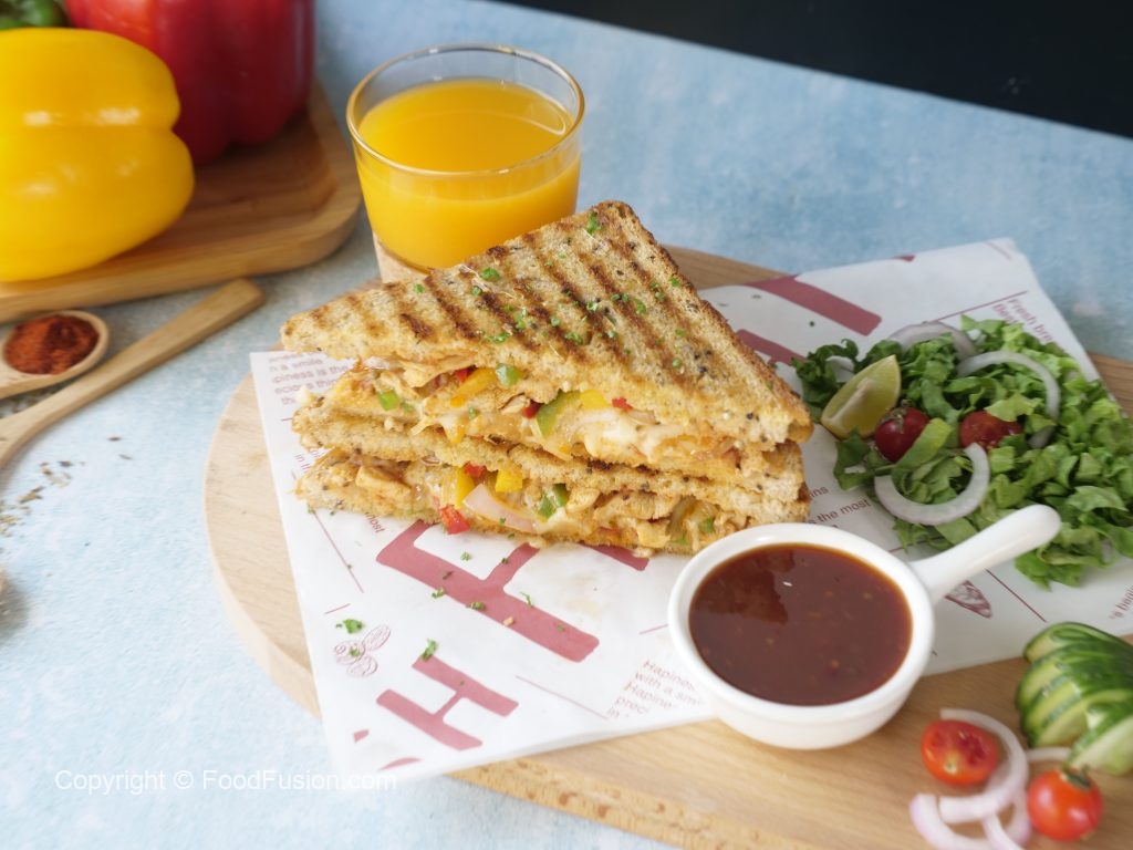 Sandwich ko flip ker lein aur halki ancch per cheese melt ho janay tak grill ker lein (makes 4 sandwiches).