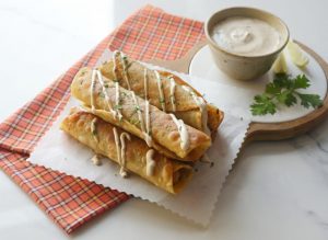 On corn tortilla,add cheese mixture,chicken fries and roll up each tortilla tightly and secure with a toothpick.