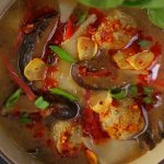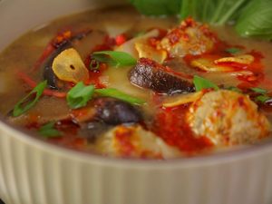 -Chicken mixture ka 1 tbs le kar broth mein daal dein, dhak kar 5-6 minute medium flame par cook karein (10-12 wontons ready ho jayein ge).