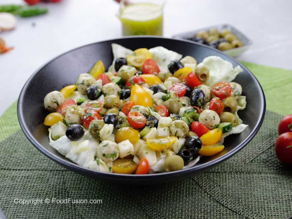 -In a bowl,add iceberg lettuce,prepared mini chicken kafta (approx. 30),black olives,green olives,cucumber,reddish, onion,yellow cherry tomatoes,red cherry tomatoes,fresh coriander,2-3 tbs of prepared gm salad dressing & give it a good mix.