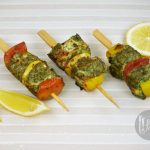 Ab marinated chicken,color bell pepper,tamatar,pyaz aur lemon slices ko skewers per assemble ker lein.