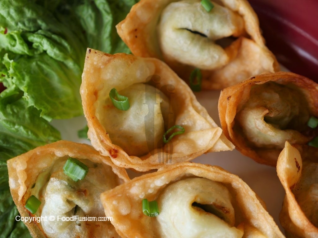 Triangle ka ek side per anda laga lein aur overlap ker ka wonton ki shape bana lein (makes 25-30).