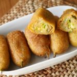 In green chilies,add masala mix or mozzarella cheese with masala mix,coat with potato coating then dip into pakora batter.