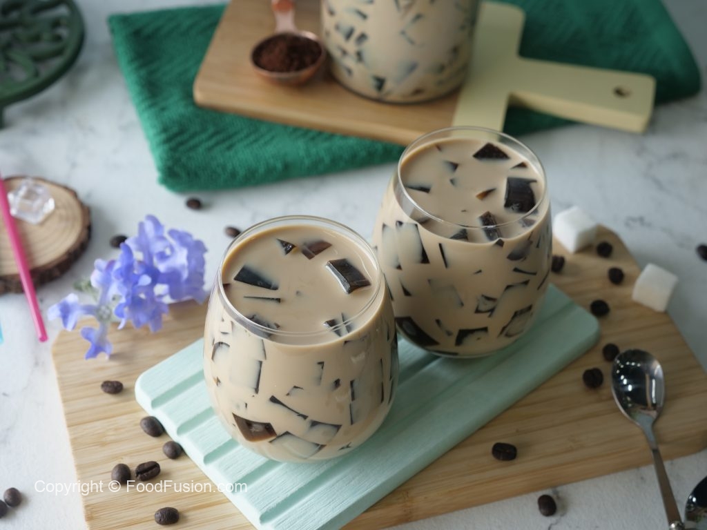 Serving glass mein tayyar coffee jelly aur tayyar cold coffee dal ker stir ker lein & serve karein!