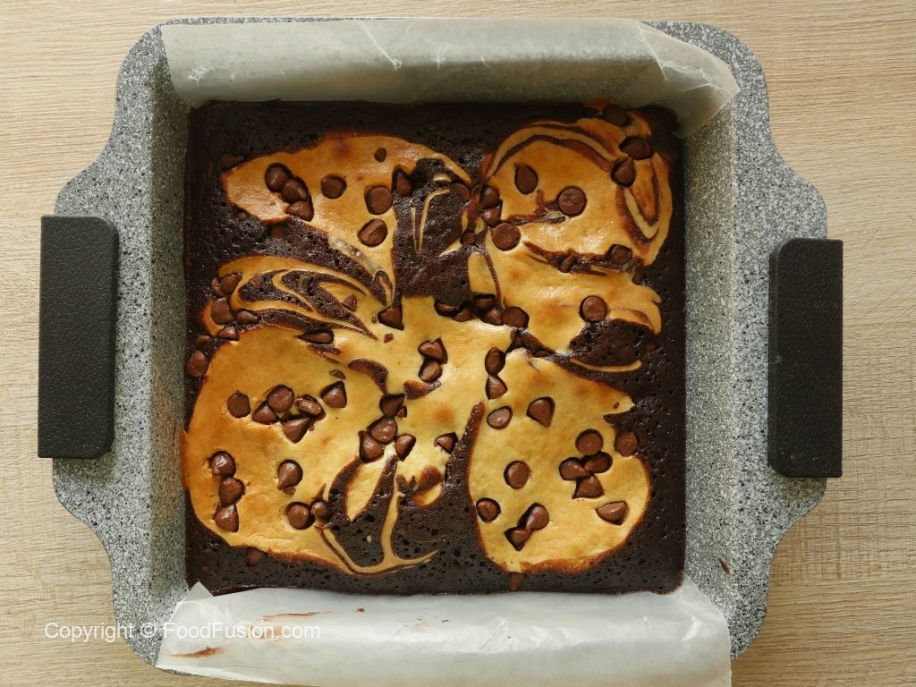 In 8 x 8 inch baking pan lined with butter paper,add prepared brownie batter and cream cheese batter and make swirls with the help of the skewer.