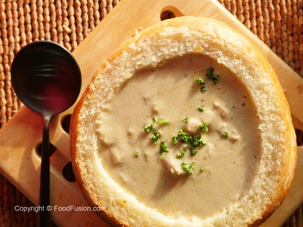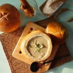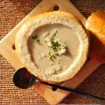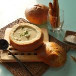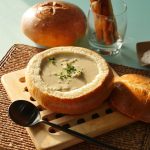 Let the bread cool down and using a knife to cut a circle out of the top of the bowls.Use a spoon to scoop out some of the extra bread so that you have enough room in the bowl for soup and reserve the bread for dipping.