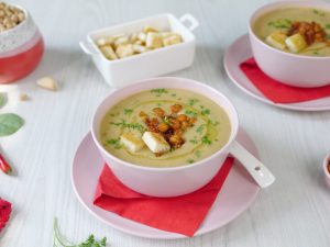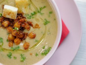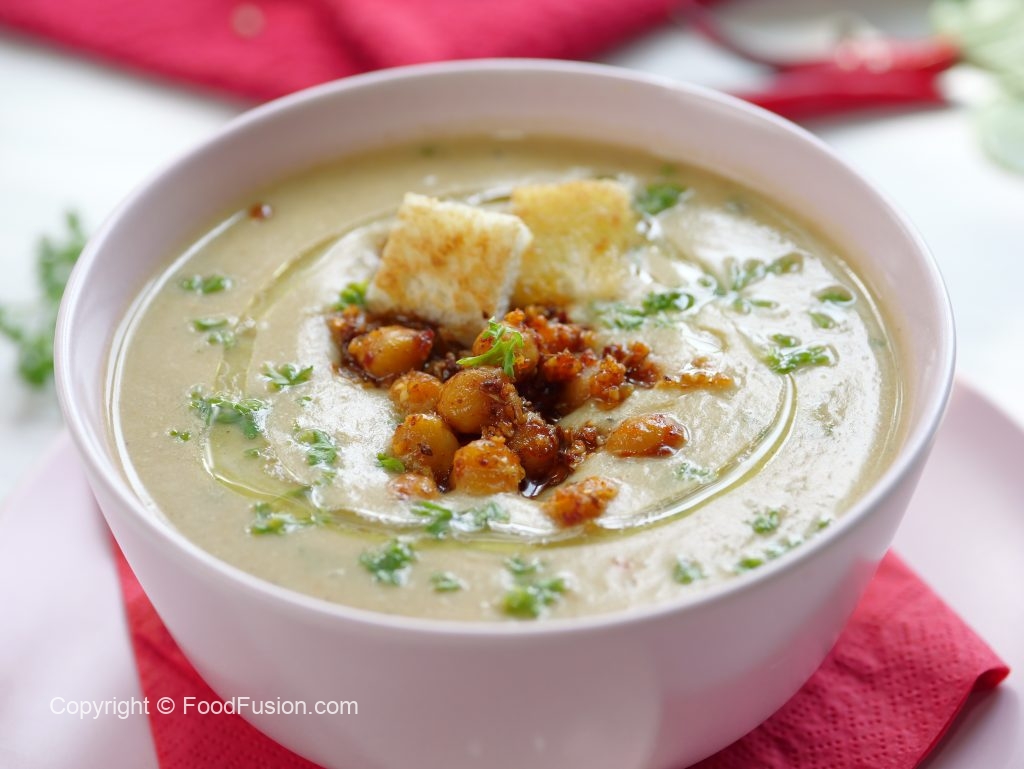 -Garnish with prepared garlicky chickpea topping,fresh parsley,croutons,olive oil & serve hot!