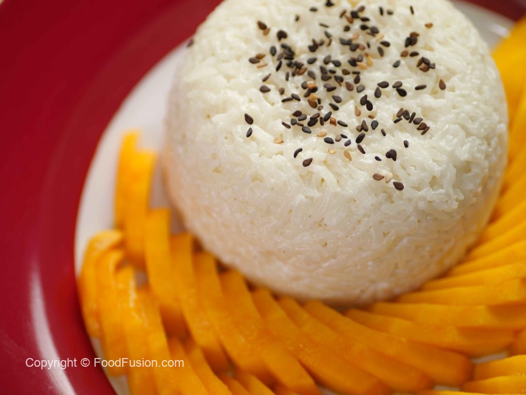 -Serving plate mein sticky rice,mango slices,kalay til aur creamy coconut sauce dal kar serve karein!