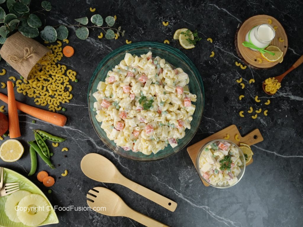 In a bowl,add potatoes,carrots,apple,peas,pineapple,boiled elbow macaroni & mix well.