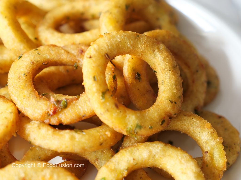 -Frying pan mein cooking oil garam karein aur potato rings ko darmiyani ancch per golden ho janay tak fry ker lein.