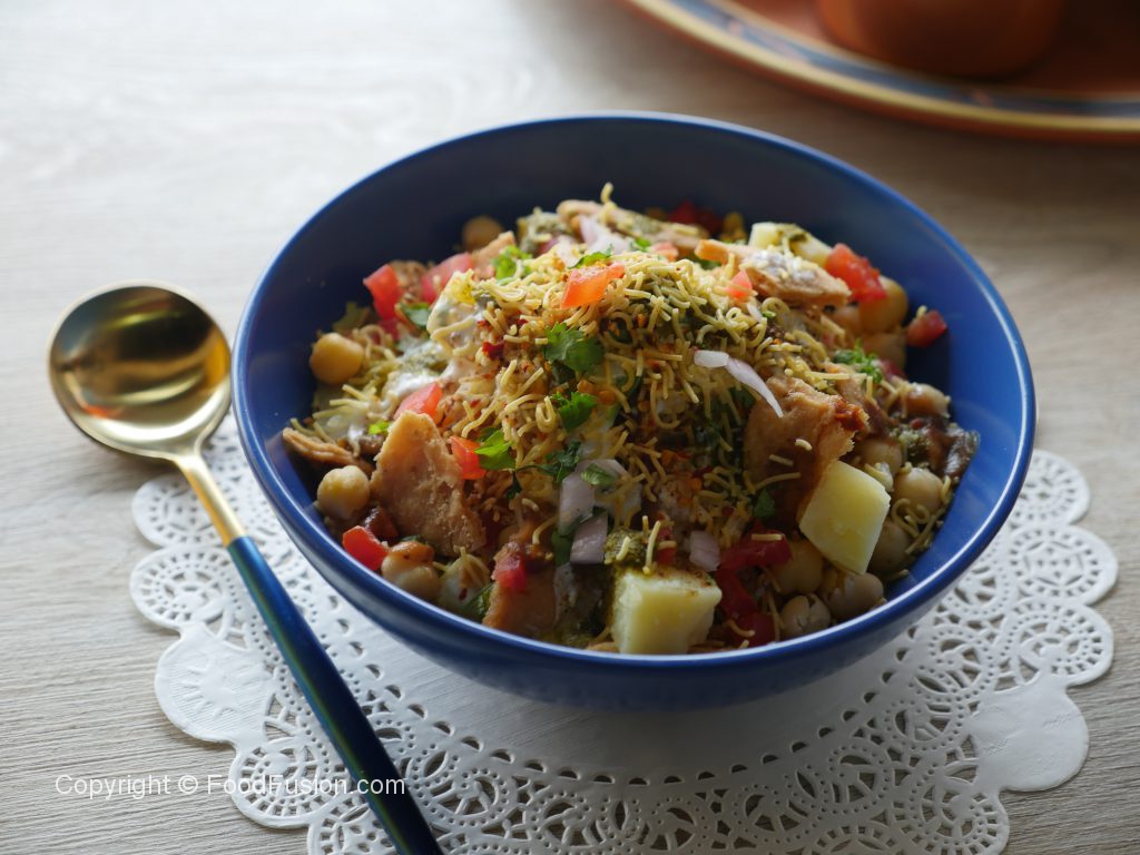 Serving plate mein papri,dumplings,chanay,aloo,tamatar,pyaz,namak,lal mirch crushed,chaat masala, zeera,lemon juice,hari chutney,khajure imli chutney,dahi,chanay,papri,aloo,tamatar,pyaz,sev nimco,dahi,hari chutney,khajure imli chutney,hari chutney,lal mirch crushed,namak,chaat masala aur hara dhania dal ker serve karein.