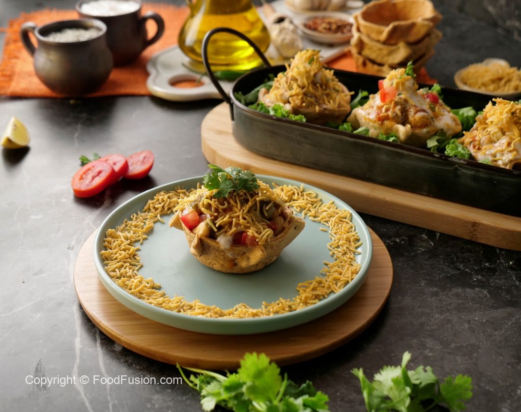 On dough pocket,add bhondi,chaat masala,potato,tomato,onion,spicy hari chutney,imli ki meethi chutney,prepared yogurt,chaat masala,red chilli powder,sev nimco & serve!