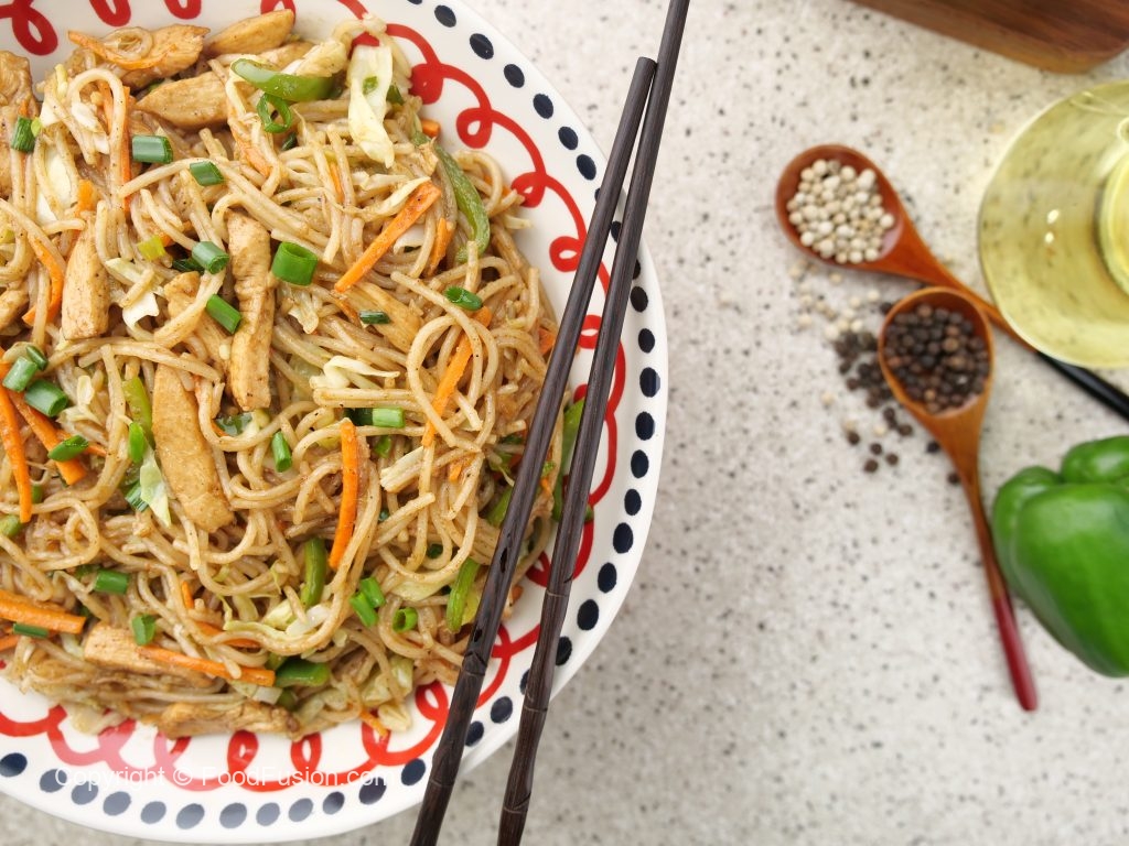 -In a wok,add cooking oil,carrots,capsicum,cabbage,mix well & sauté for a minute & set aside.