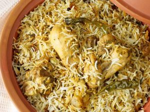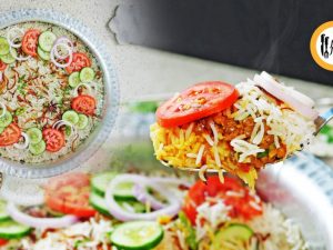 -Lemon juice,hara dhania,podina,hari mirchein,fried nuts,boiled chawal,zarda ka rang,biryani essence,podina,hara dhania,hari mirchein,fried nuts aur ghee dal dein,kitchen cloth & lid sa cover karein aur halki ancch per 12-15 minutes kliya steam cook ker lein.