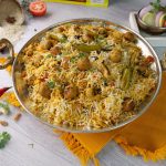 -Add lemon juice,fresh coriander,mint leaves,green chillies,fried nuts,boiled rice,orange food color, biryani essence,mint leaves,fresh coriander,green chillies,fried nuts & clarified butter,cover with kitchen cloth & lid and steam cook on low flame for 12-15 minutes.