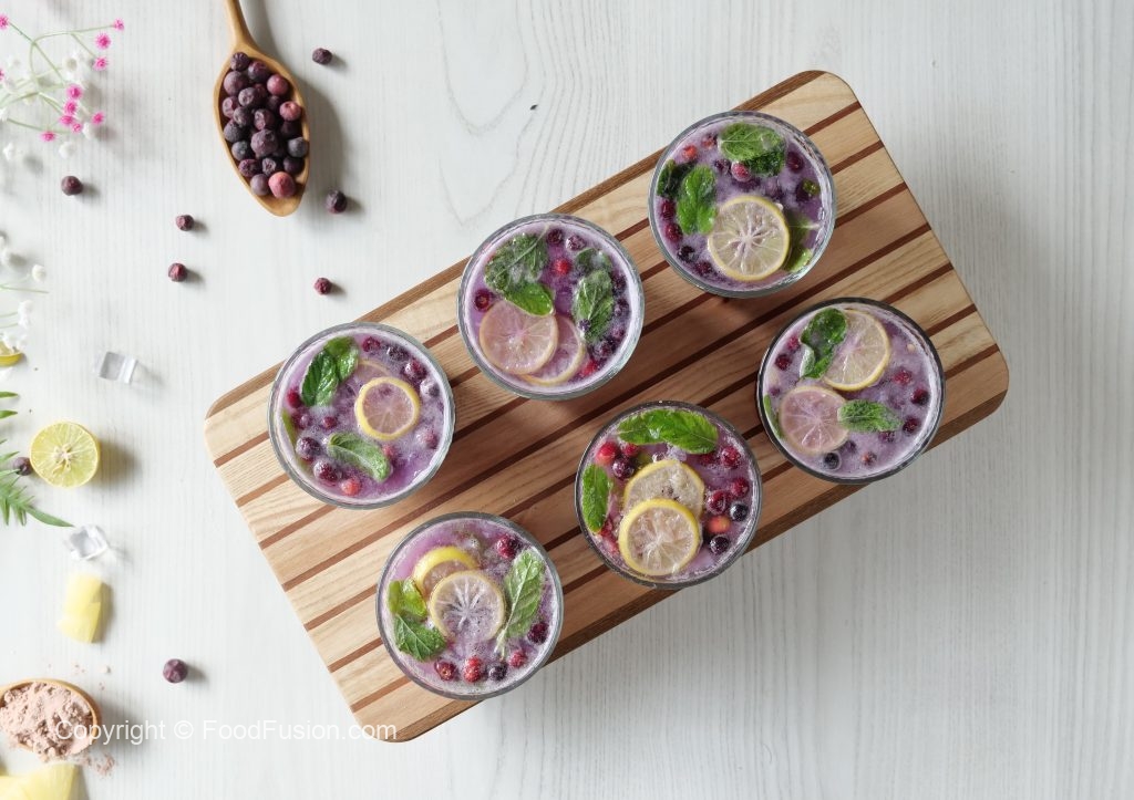 -Serving glass mein lemon slices,pineapple chunks aur podian dal ker muddle ker lein.
