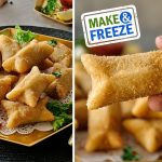 Tayyar chicken curry filling ko dough ka center mein dal dein,edges per pani laga lein aur do opposite sides ko stick ker lein phir remining sides ko bhi stick ker ka properly seal ker lein (makes 25-26).