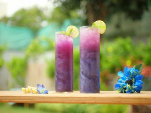 -In a glass,add crushed ice,prepared butterfly pea syrup (3/4 cup),edible silver glitter & mix well.