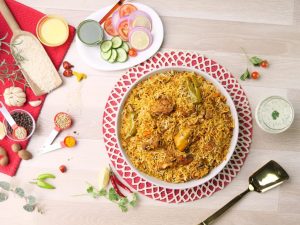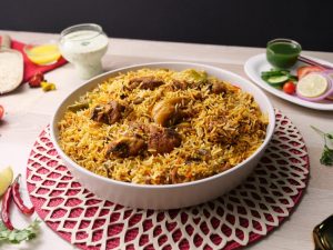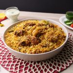 -Add mint leaves,fresh coriander,green chillies,boiled rice,mint leaves,fresh coriander,green chillies, fried onion,orange food color & desi ghee,cover with kitchen cloth & lid and steam cook on low flame for 10-12 minutes.