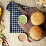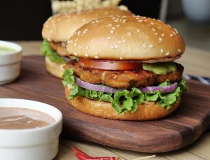 On burger bun,add & spread bbq burger sauce,lettuce leaves,onion rings,chicken chapli kabab,tomato slice and prepared chatpati hari chutney.