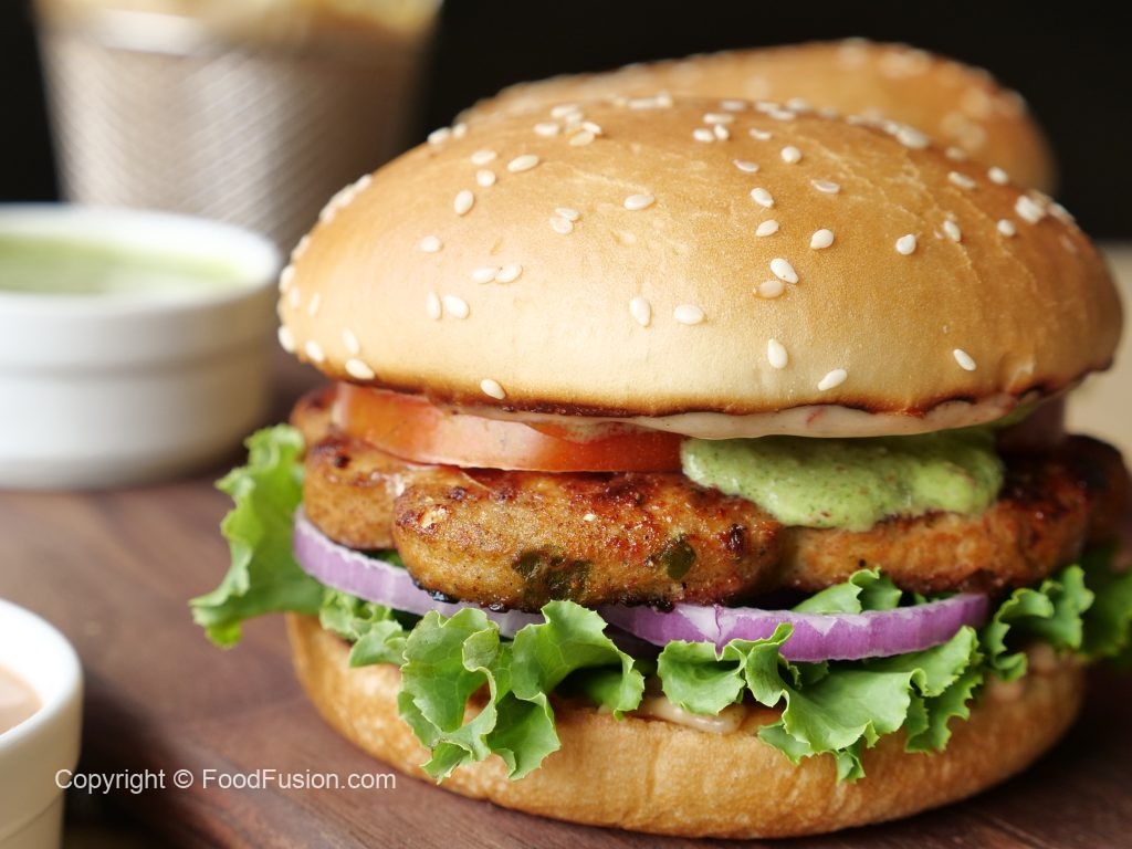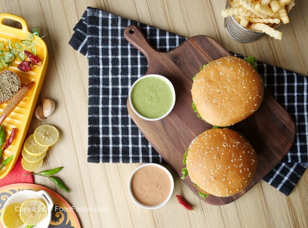 Serve with potato fries,prepared chatpati hari chutney & bbq burger sauce!
