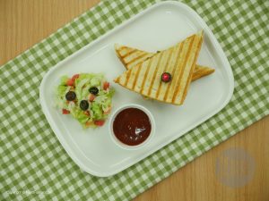 Grease grill pan with butter,place bread slice,add filling and cheddar cheese,cover with another bread slice,spread butter and grill the sandwich until golden brown and cheese is melted.